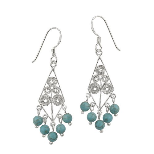 Sterling Silver Diamond Shaped Filigree French Wire Earrings with 5 Turquoise Drops Overview