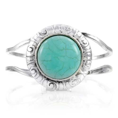 Flora's Turquoise Cuff Bracelet brings fantasy and romance to your look. Silver tone double band bracelet opens on a hinge for easy on/off. Opening tucks behind the faux turquoise stone when worn for a seamless look. Large (about the size of a quarter) round faux turquoise stone has variations in hue and markings for a natural look - no two are exactly the same! Fits a normal sized wrist, approximately 7.5 inches. This item arrives in our premium Special Edition themed gift box at no extra charge! Matte black box has shiny inlaid tree design. Perfect for presents - no gift wrap required! Weight: 33.7 gMetal: Lead free silver tone