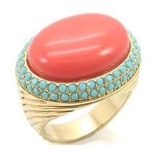 The colors of this fun cocktail ring are vibrant and lovely to look at. Set into a 14k gold electroplated ring is a genuine cabochon cut coral stone that is then accented with dainty turquoise crystal stones. The coral and turquoise pair with each other so wonderfully. It will add a great pick me up to any ensemble. The gold ring base has been etched with lines to add a great detailing to this overall design. Semi-precious jewelry can be quite expensive, but not at Fantasy Jewelry Box! We always keep our jewelry prices as affordable as possible because we don't believe that you have to spend a lot in order to look stylish. And with a chic cocktail ring like this, you will feel so fashion forward. Get ready to be given a lot of compliments because that is exactly what will come your way whenever you accessorize with this piece.>Talullah's 14k Gold Genuine Coral & Turquoise Stone Cocktail Ring Review